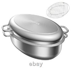 Roasting Pan with Rack and Lid 12 Quart, 18/10 Stainless Steel Multi-Use Oval Dutch Oven, Induction Compatible Dishwasher/Oven Safe Turkey Roaster, 17 Inch. SUPERIOR COOKING SURFACE-The 18/10 roasting pans stainless steel exterior surface does not discolor, react with food, or alter flavors. EVEN HEAT DISTRIBUTION: Triple-Ply construction aluminum encapsulated base heats quickly and spreads heat evenly; Suitable for all stoves, including induction cookers, stovetops, ovens, and grills.